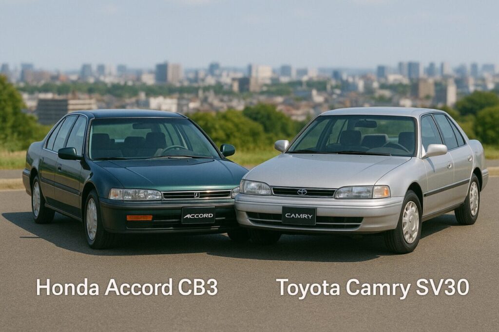 アコードCB3とトヨタ・カムリSV30は、同時代のミドルクラスセダンでありながら、メーカー思想の違いがはっきりと表れた2台。