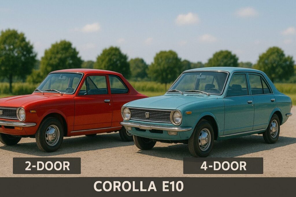 カローラE10の2ドアと4ドアは、基本の外寸こそほぼ共通ですが、ドア構造の違いが室内空間の使い勝手・乗降性・後席の居住性に大きな差を生みます。