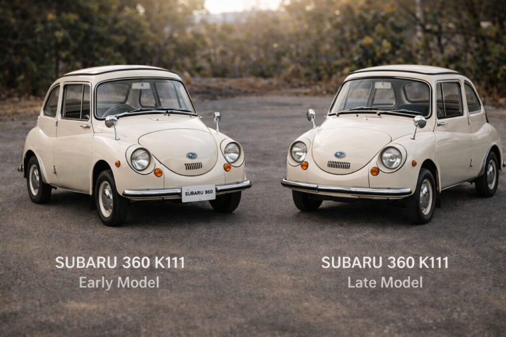 スバル360 K111の前期・後期の違いは、明確なフルモデルチェンジによる区分ではなく、年次改良の積み重ねによって生じた差です。