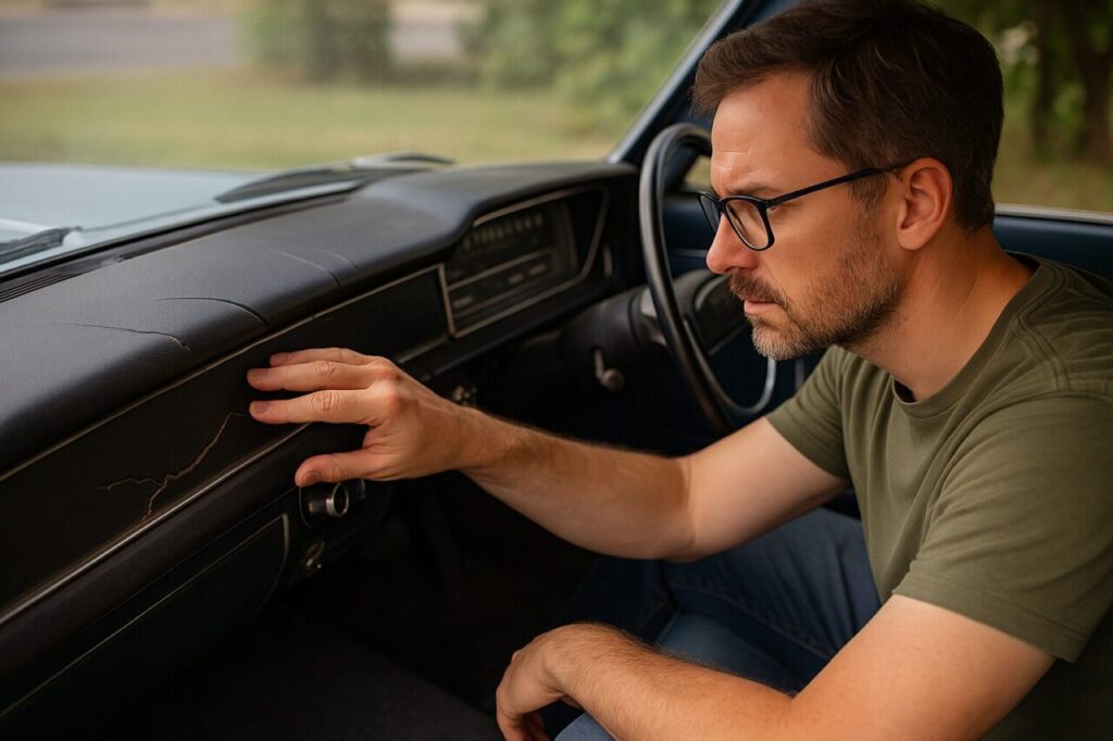 ダッシュは割れや反りがほぼ避けられず、天井はウレタンの粉化が進んで張り替え前提、シートは表皮よりもウレタンの状態が重要になります。